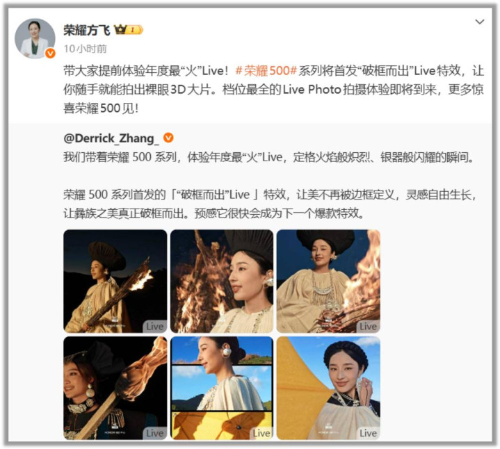 “带大家提前体验年度最“火”Live!#荣耀500#系列将首发“破框而出”Live特效,让你随手就能拍出裸眼3D大片。档位最全的Live Photo拍摄体验即将到来,更多惊喜荣耀500见!”
