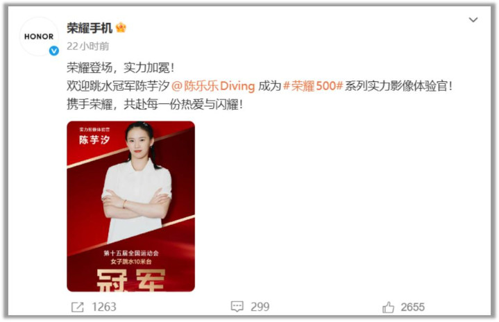 与此同时我们在荣耀手机官方微博表示:欢迎跳水冠军陈芋汐@陈乐乐Diving 成为#荣耀500#系列实力影像体验官!携手荣耀,共赴每一份热爱与闪耀!
