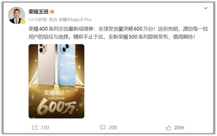 荣耀400系列智能手机迎来了一个重要的里程碑——全球销量突破600万台!这款上一代的次旗舰凭借其出众的设计与卓越的影像能力,在消费市场赢得了极高的声誉。