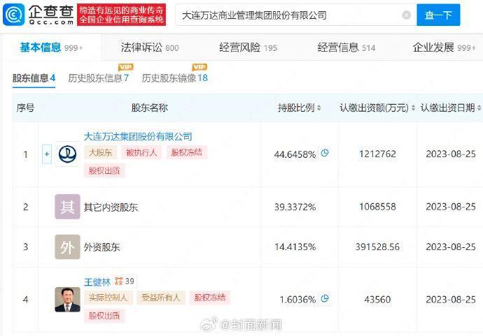 企查查信息显示,大连万达商业管理集团股份有限公司成立于2002年9月,法定代表人为张春远,注册资本约271.6亿元,经营范围包含建设工程设计、商业综合体管理服务、非居住房地产租赁等,由大连万达集团股份有限公司、王健林等共同持股,王健林为该公司实际控制人。值得注意的是,该公司现存多条被执行人、股权冻结信息。